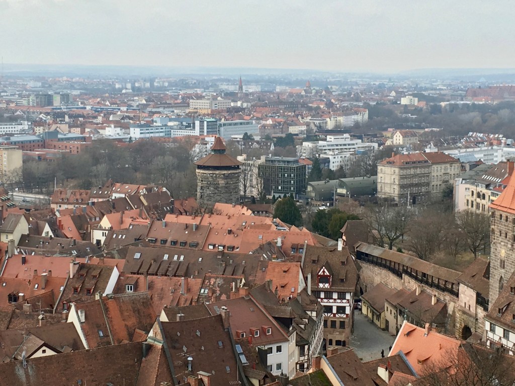 A view toward the west from the Nuremberg Castle Tower, showing the Neutorturm (New Gate Tower) along the northern section of the ancient Citywall, which like Rothenburg ob der Tauber also can be walked.