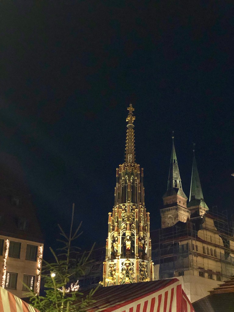 The ‘Schöner Brunnen’ at the main market square during the rest of the year with the St. Sebald’s Church in the background.